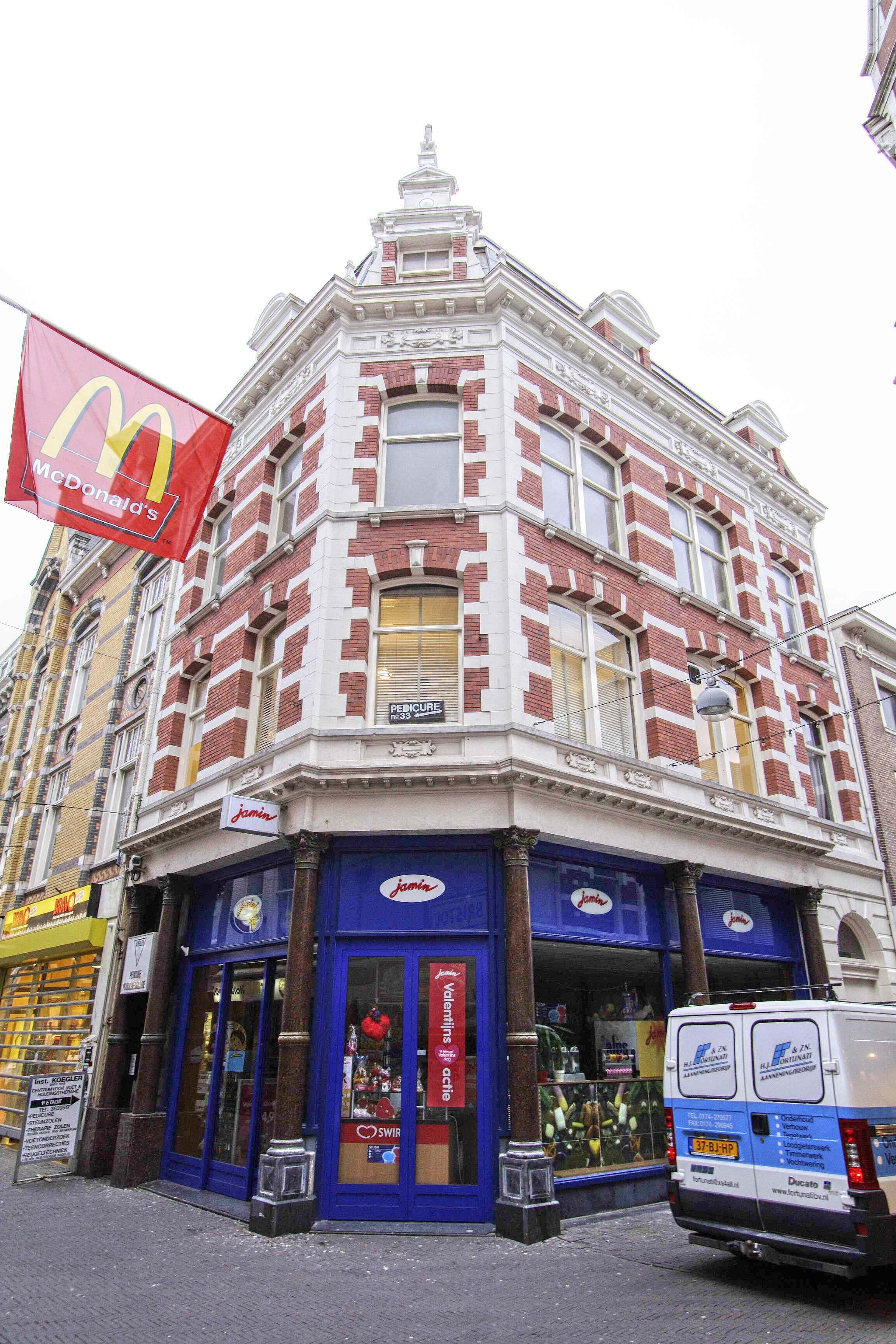 Het pand heeft een twee assen brede gevel aan de Vlamingstraat en drie vensterassen brede gevel in de Nieuwstraat. De stedenbouwkundige situering wordt geaccentueerd door de afgeschuinde travee op de hoek van beide straten. De in schoon metselwerk uitgevoerde voorgevel is opgetrokken in een rijke neo-renaissance met tal van ornamenten in de vorm van witte sierbanden, diamantkoppen en cartouches in de kroonlijsten. Met name de rijke behandeling van de afgeschuinde hoektravee, beëindigd met een opvallende dakkapel, trekt de aandacht. De winkelpui met op hardstenen basementen geplaatste vrijstaande marmeren zuilen voorzien van korintische kapitelen is nog voor een belangrijk deel oorspronkelijk.