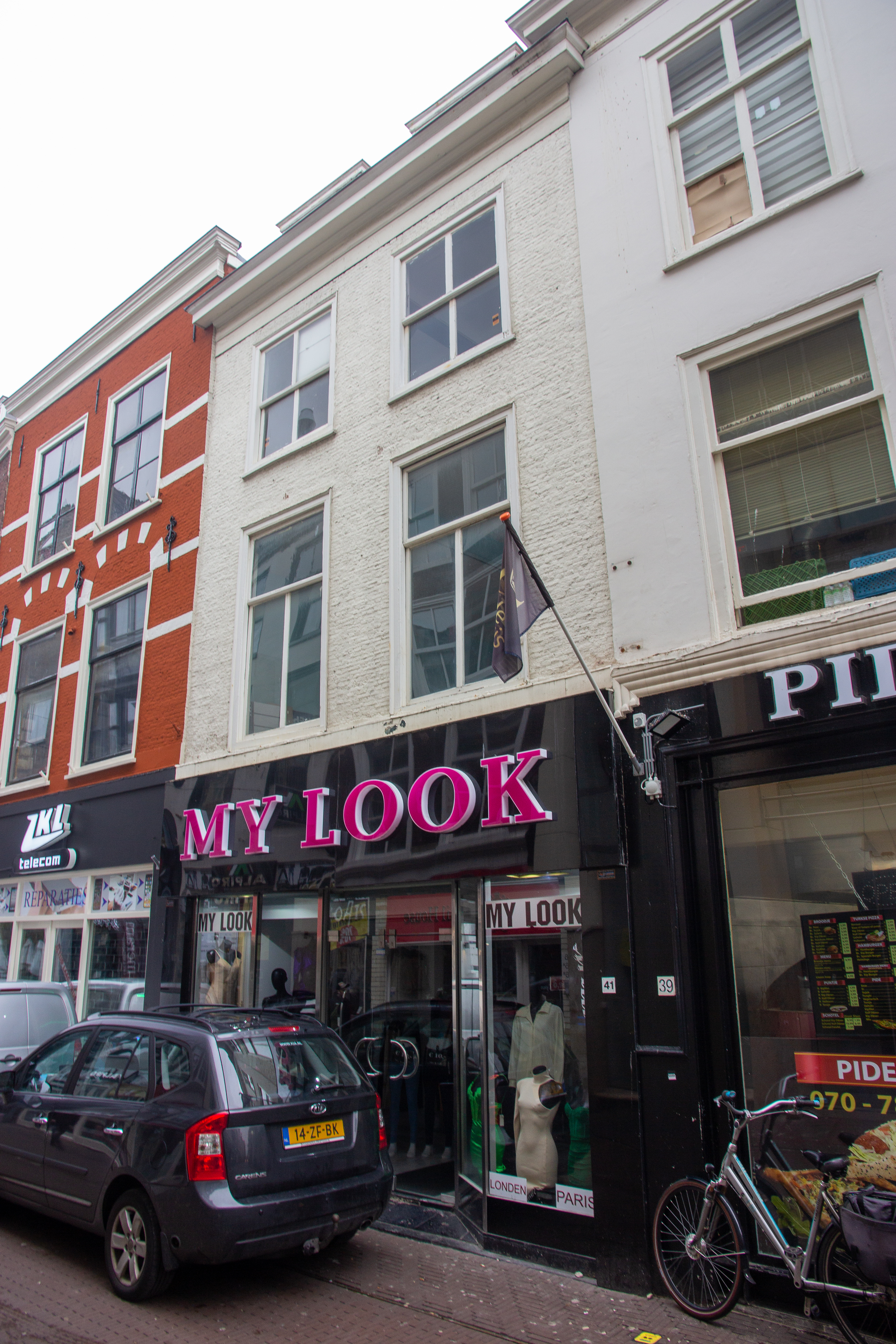 De exacte ouderdom van het pand is niet bekend maar is van ten minste zeventiende-eeuwse oorsprong. In de samengestelde balklaag van de eerste verdieping overspant de onderslagbalk of moerbalk het huis in zijn langste richting, namelijk van de voor- naar de achtergevel. Haaks hierop liggen dwarsbalken (kinderbinten). Het ter rechterzijde gelegen buurpand heeft een soortgelijke balklaag. Dit is een aanwijzing dat beide huizen oorspronkelijk deel uitmaakten van één tweelaags zestiende - of zeventiende-eeuws breed huis, zoals op oude kaarten is weergegeven. Uit de oudste bouwfase is naast de genoemde balklaag nog een spiltrap aanwezig tussen de eerste en tweede verdieping. De voorgevel is een achttiende-eeuwse lijstgevel van drie bouwlagen in schoonmetselwerk van handvormbaksteen, verdeeld in twee vensterassen. De witte beschildering behoort niet tot de oorspronkelijke opzet. In de hoeken van de gevel zijn hoekverbanden met klezoortjes herkenbaar. Boven de vensters bevinden zich eenvoudige rollagen. Op de eerste verdieping bevinden zich twee vensters, waarvan de kozijnen nog uit de achttiende eeuw dateren. De ramen stammen uit het midden van de negentiende eeuw maar bezaten aanvankelijk een zesruitsverdeling met brede middenroeden. De beide vensters op de tweede verdieping bestaan uit achttiende-eeuwse kozijnen met midden negentiende-eeuwse vierruitsramen. De winkelpui op de begane grond bestaat uit een omlijsting uit 1955 met een meer recente invulling. Uit de achttiende eeuw stamt ook nog de kapconstructie. Deze vangt al aan op de tweede verdieping en heeft een voor een dwarshuis kenmerkende opzet met een muurstijl tegen de voorgevel en spantbeen aan de achterzijde. De vloerbalken van de zoldervloer rusten op dit spant.
