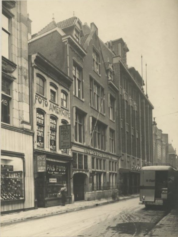 De voorgevel is een op vlucht gebouwde drielaagse lijstgevel uit de tweede helft van de 18de eeuw, die vrij recent grijs geschilderd is. De verdiepingshoogte neemt in de gevel naar boven toe af. De gevel wordt afgesloten door een recht hoofdgestel met vier rijk gesneden Lodewijk XIV-consoles in het van spiegellijsten voorziene fries. Alle kozijnen bezitten bovendorpels met schouderbogen en dateren uit de bouwtijd. De raamindeling is van een latere periode. De rijke detaillering van de kozijnen en de kroonlijst duiden erop dat dit in de achttiende eeuw een voornaam woonhuis moet zijn geweest. In de tweede helft van de negentiende eeuw heeft het zijn huidige winkelfunctie gekregen. In 1888 werd een nieuwe winkelpui aangebracht die voor een belangrijk deel nog bewaard is gebleven.