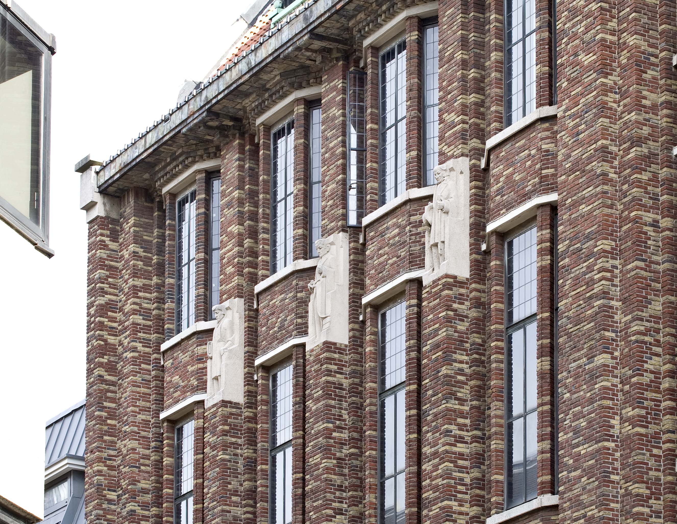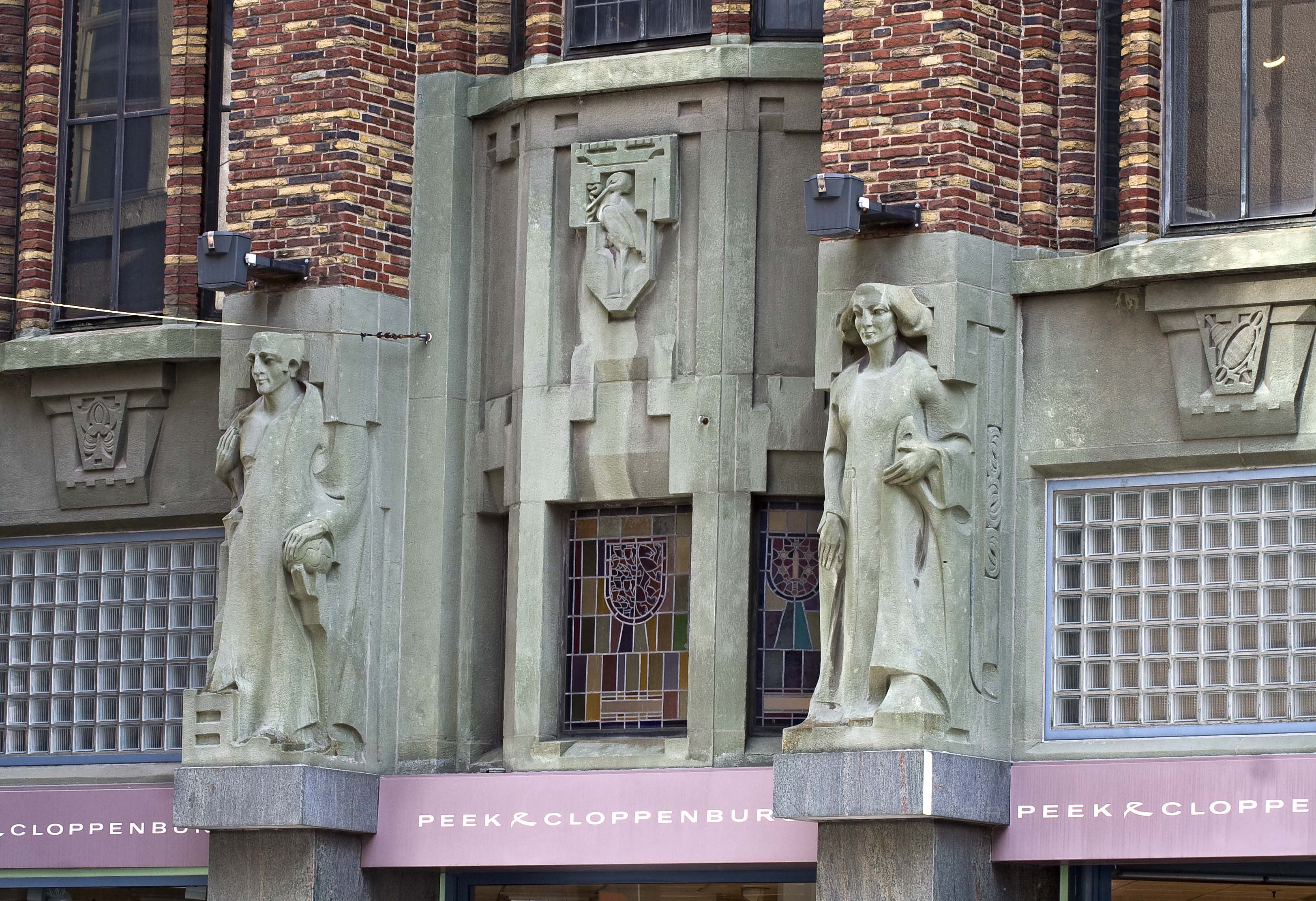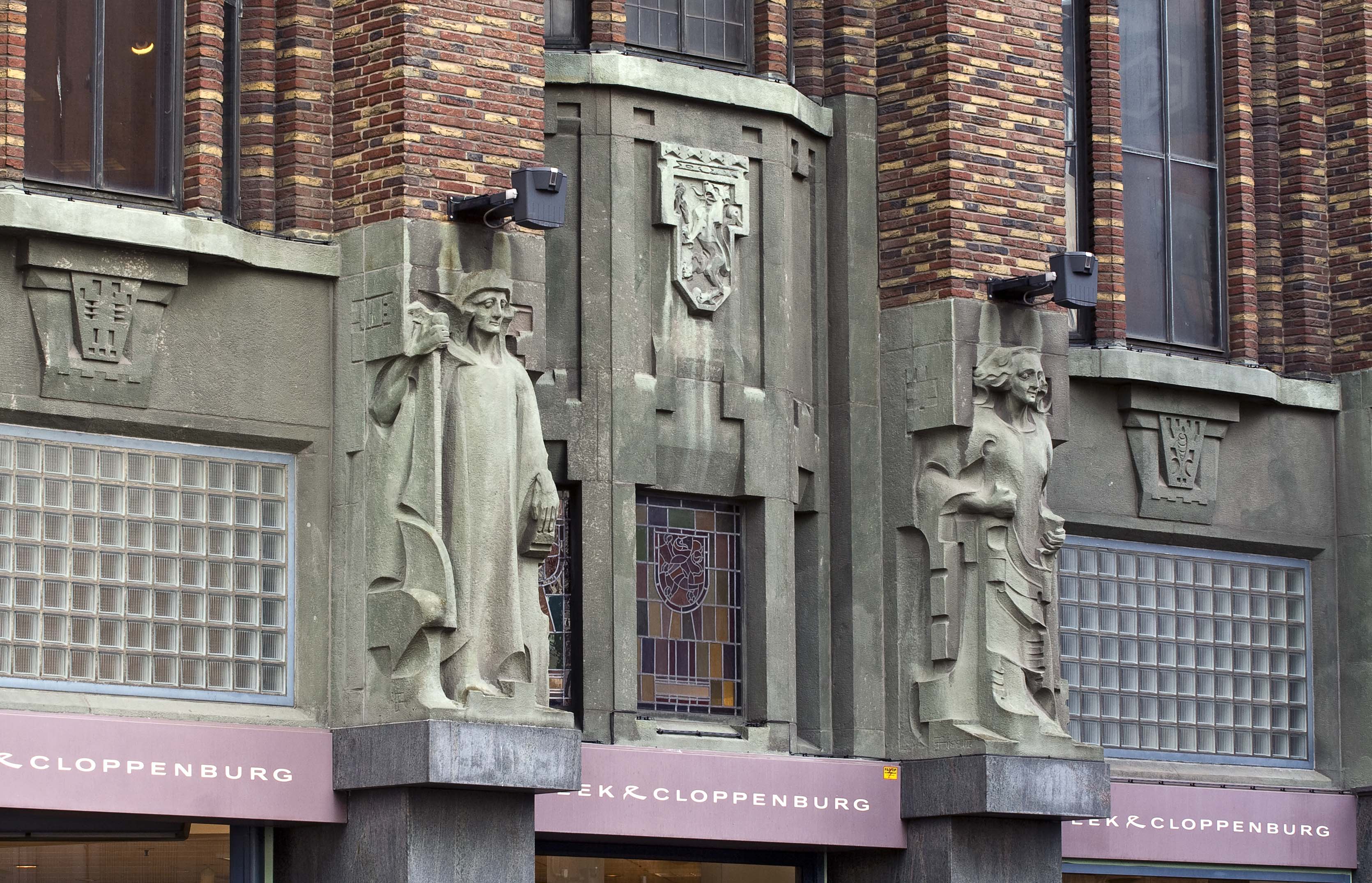 Pieter Biesiot was als hoofdbeeldhouwer aangetrokken bij de bouw van de nieuwe modewinkel. De grote beelden die op de beide hoofdingangen staan zijn van hem. Aan de kant van de Grote Marktstraat staan links de Handel, gepersonifieerd door Mercurius, de god van de handel met zijn gevleugelde staf en rechts de personificatie van de Nijverheid. Haar attributen zijn echter zo geabstraheerd dat deze niet duidelijk zijn. Op de ingang aan de Wagenstraat vinden we links de Groothandel met wereldbol en rechts het Kleinbedrijf, verbeeld door een meetlint en een stapel stof. De zij-ingang kent wat bescheidener beeldhouwwerk in de vorm van drie fijn gesneden reliëfs boven de glas-in-lood ramen. Een gevleugeld wiel, symbool van de spoorwegen en het vervoer, de staf van Mercurius met de twee slangen en de wijze uil van Minerva vertellen iets over de wereld van de handel. De drie kleinere beelden van zandsteen tussen de ramen van de derde en vierde laag aan de kant van de Wagenstraat zijn gerelateerd aan de werkzaamheden in het modebedrijf. Zo knipt een coupeur met een enorme schaar een lap stof doormidden en is een wever druk bezig met het vervaardigen van stoffen. Op nog kleinere blokken steen zijn verschillende plant- en diermotieven aangebracht. Zij hebben een plaatsje gekregen omdat aan hun wereld de stoffen voor het bedrijf worden ontleend. Dit werk is van de Haagse beeldhouwer H.G.J. van Remmen.