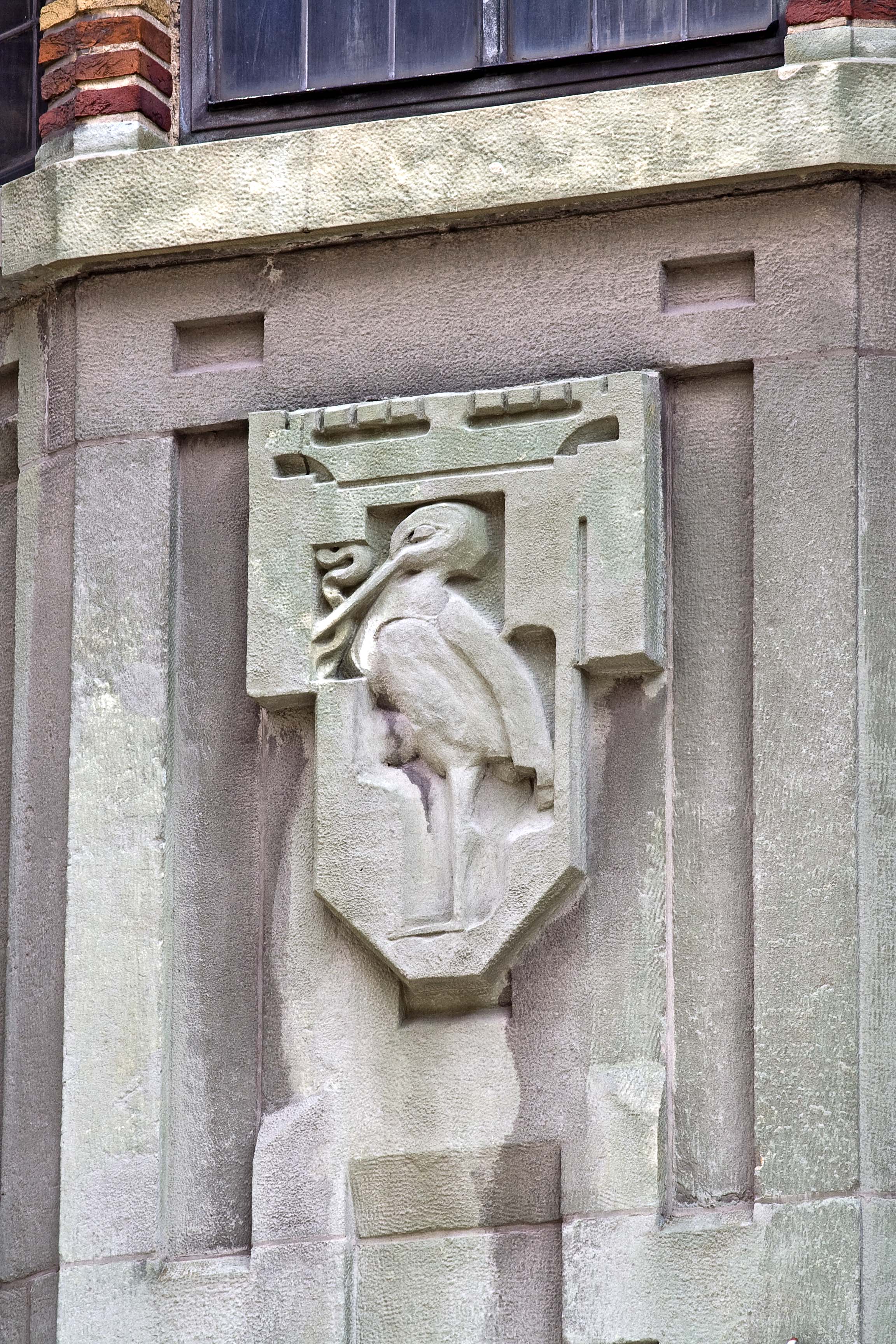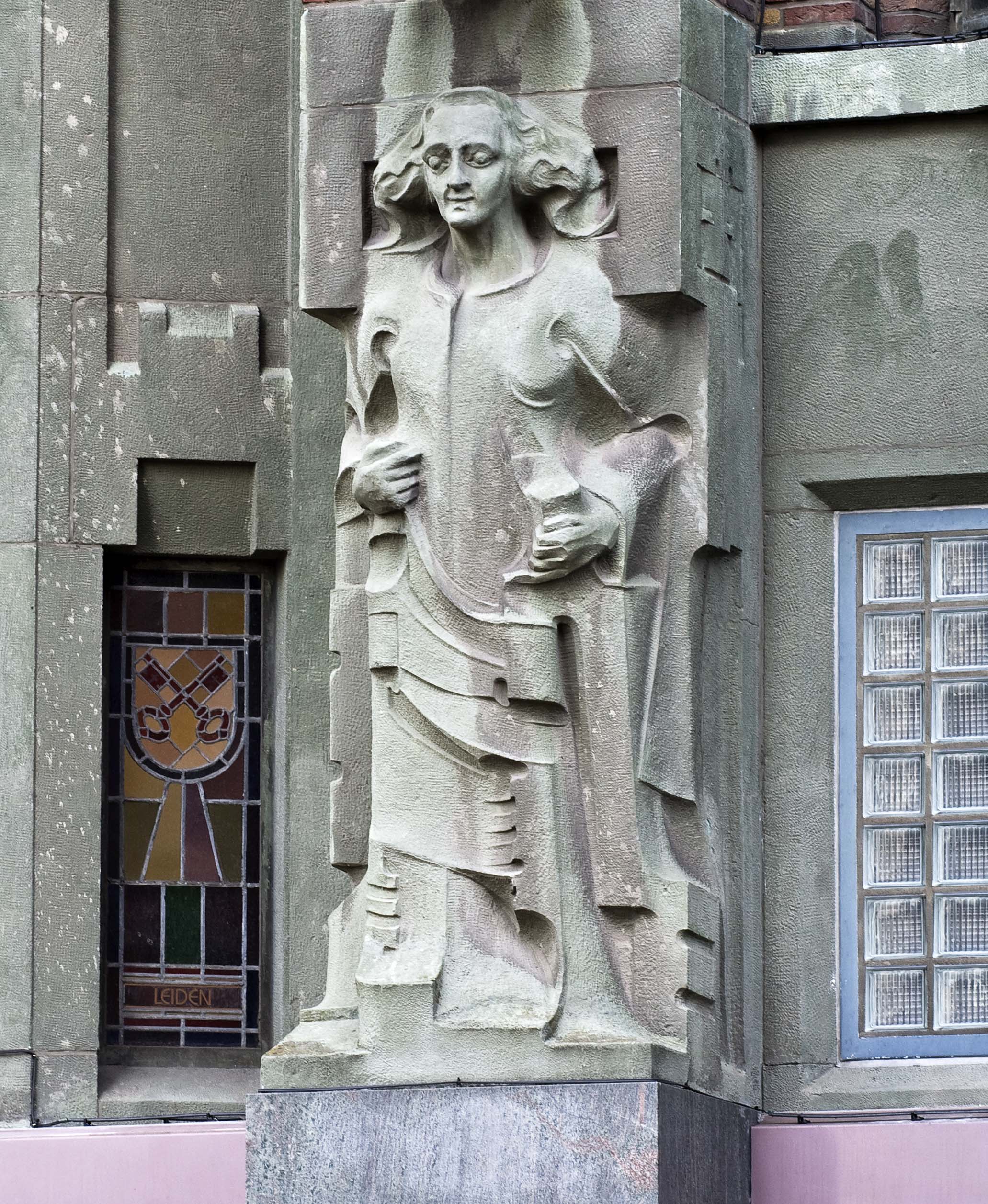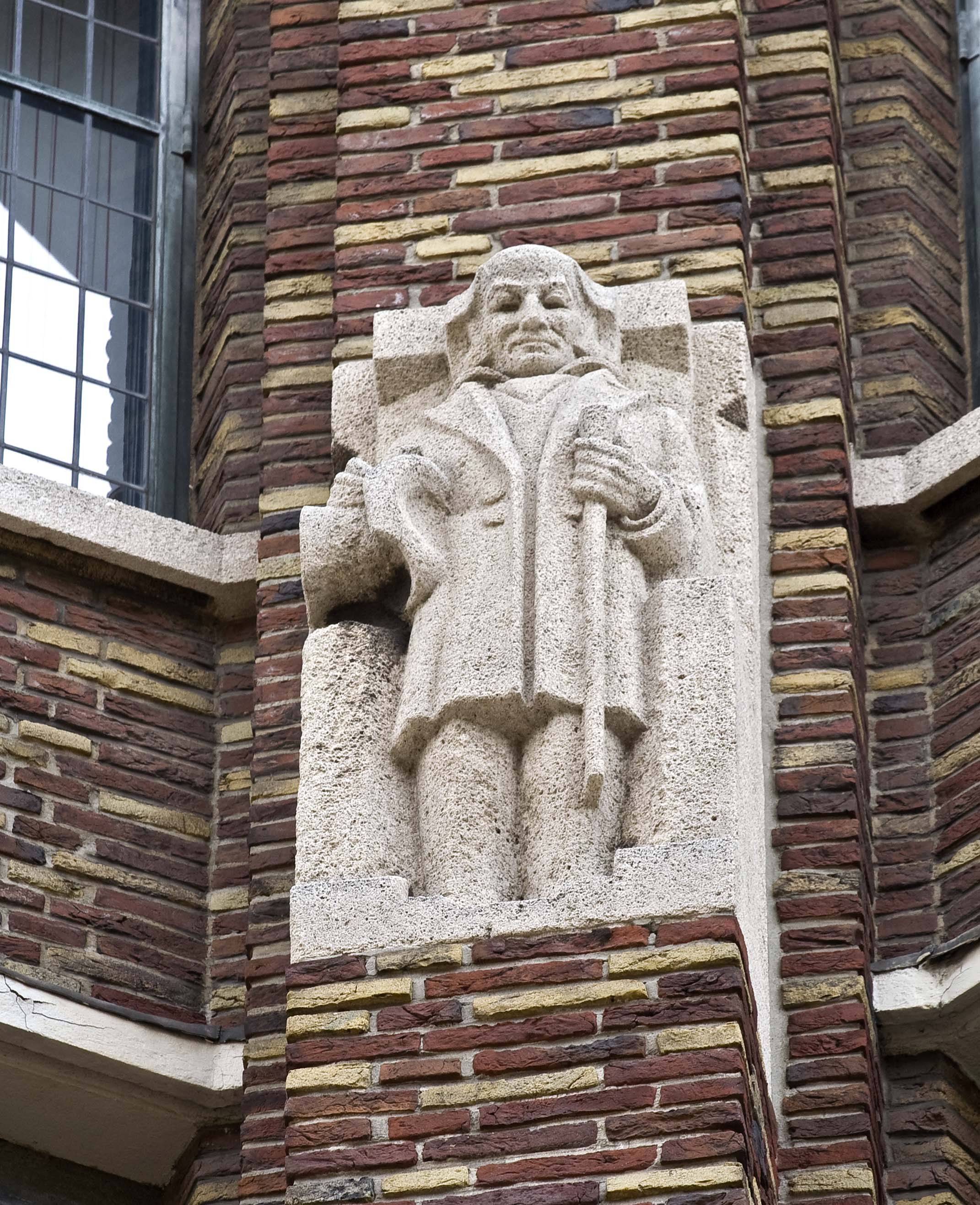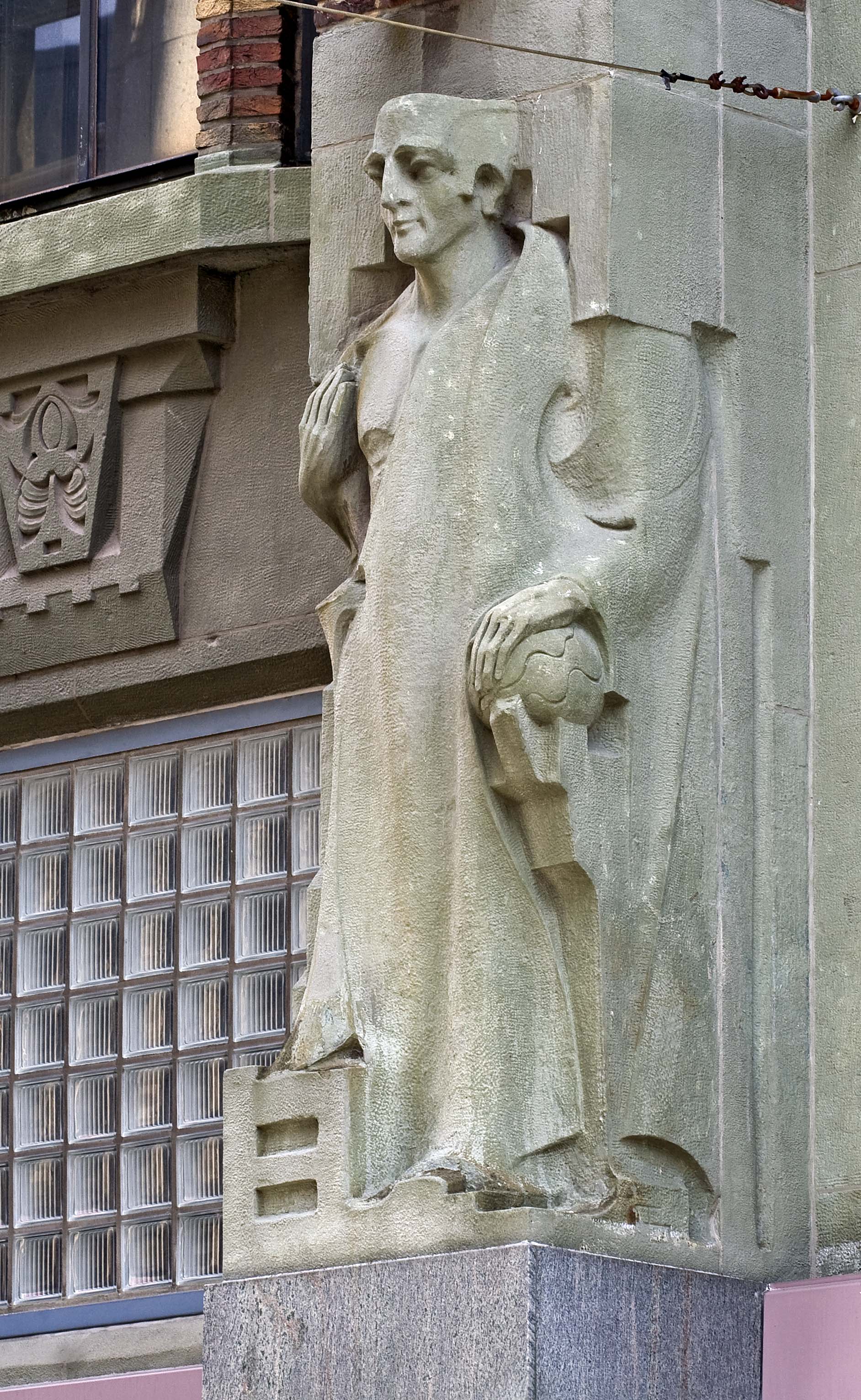 Pieter Biesiot was als hoofdbeeldhouwer aangetrokken bij de bouw van de nieuwe modewinkel. De grote beelden die op de beide hoofdingangen staan zijn van hem. Aan de kant van de Grote Marktstraat staan links de Handel, gepersonifieerd door Mercurius, de god van de handel met zijn gevleugelde staf en rechts de personificatie van de Nijverheid. Haar attributen zijn echter zo geabstraheerd dat deze niet duidelijk zijn. Op de ingang aan de Wagenstraat vinden we links de Groothandel met wereldbol en rechts het Kleinbedrijf, verbeeld door een meetlint en een stapel stof. De zij-ingang kent wat bescheidener beeldhouwwerk in de vorm van drie fijn gesneden reliëfs boven de glas-in-lood ramen. Een gevleugeld wiel, symbool van de spoorwegen en het vervoer, de staf van Mercurius met de twee slangen en de wijze uil van Minerva vertellen iets over de wereld van de handel. De drie kleinere beelden van zandsteen tussen de ramen van de derde en vierde laag aan de kant van de Wagenstraat zijn gerelateerd aan de werkzaamheden in het modebedrijf. Zo knipt een coupeur met een enorme schaar een lap stof doormidden en is een wever druk bezig met het vervaardigen van stoffen. Op nog kleinere blokken steen zijn verschillende plant- en diermotieven aangebracht. Zij hebben een plaatsje gekregen omdat aan hun wereld de stoffen voor het bedrijf worden ontleend. Dit werk is van de Haagse beeldhouwer H.G.J. van Remmen.