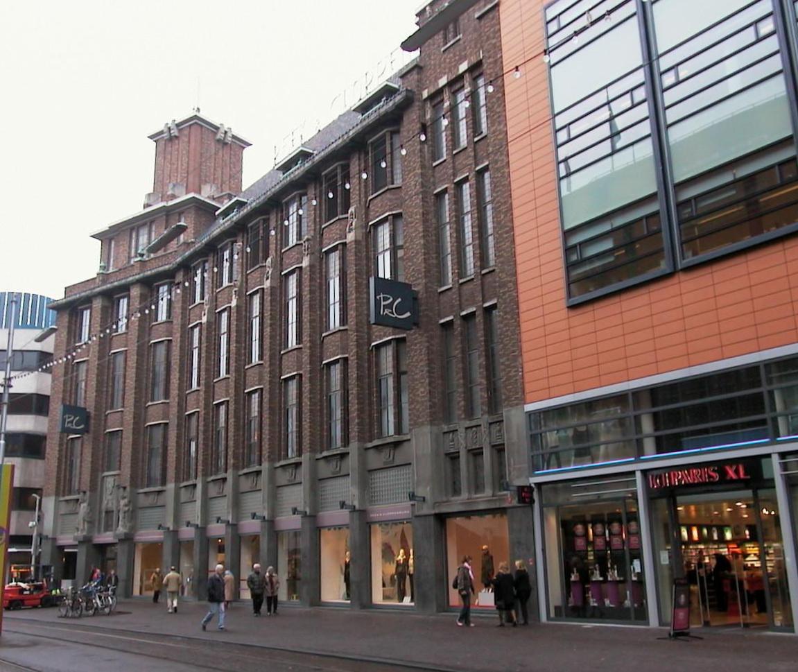 Kledingmagazijn van de firma Peek & Cloppenburg uit 1932 naar een zakelijk-expressionistisch ontwerp van de Haagse architecten H.J.W. Thunnissen en J.H. Hendriks op de hoek van de Wagenstraat en Grote Markstraat. Het warenhuis is tot stand gekomen na de verkeersdoorbraak van de Grote Markstraat in 1925 en is kenmerkend voor de schaalvergroting in het 'city-vormingsproces' dat hiermee gepaard ging aan het begin van de jaren dertig.