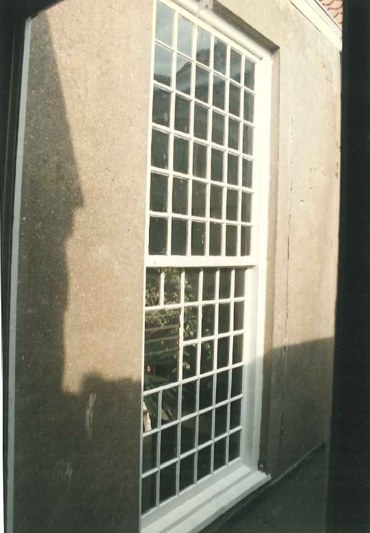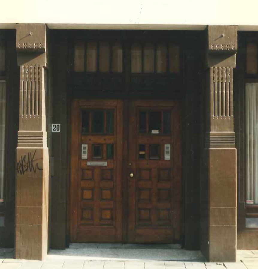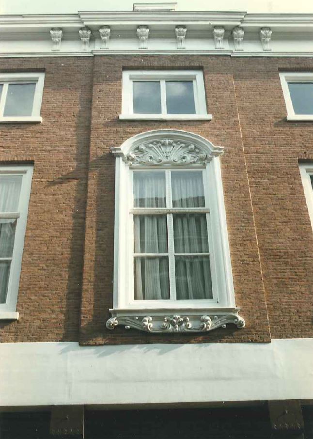 Pand met Lodewijk XIV gevel met rechte kroonlijst op gesneden consoles, versierd middenvenster, onderpui ingrijpend gewijzigd.