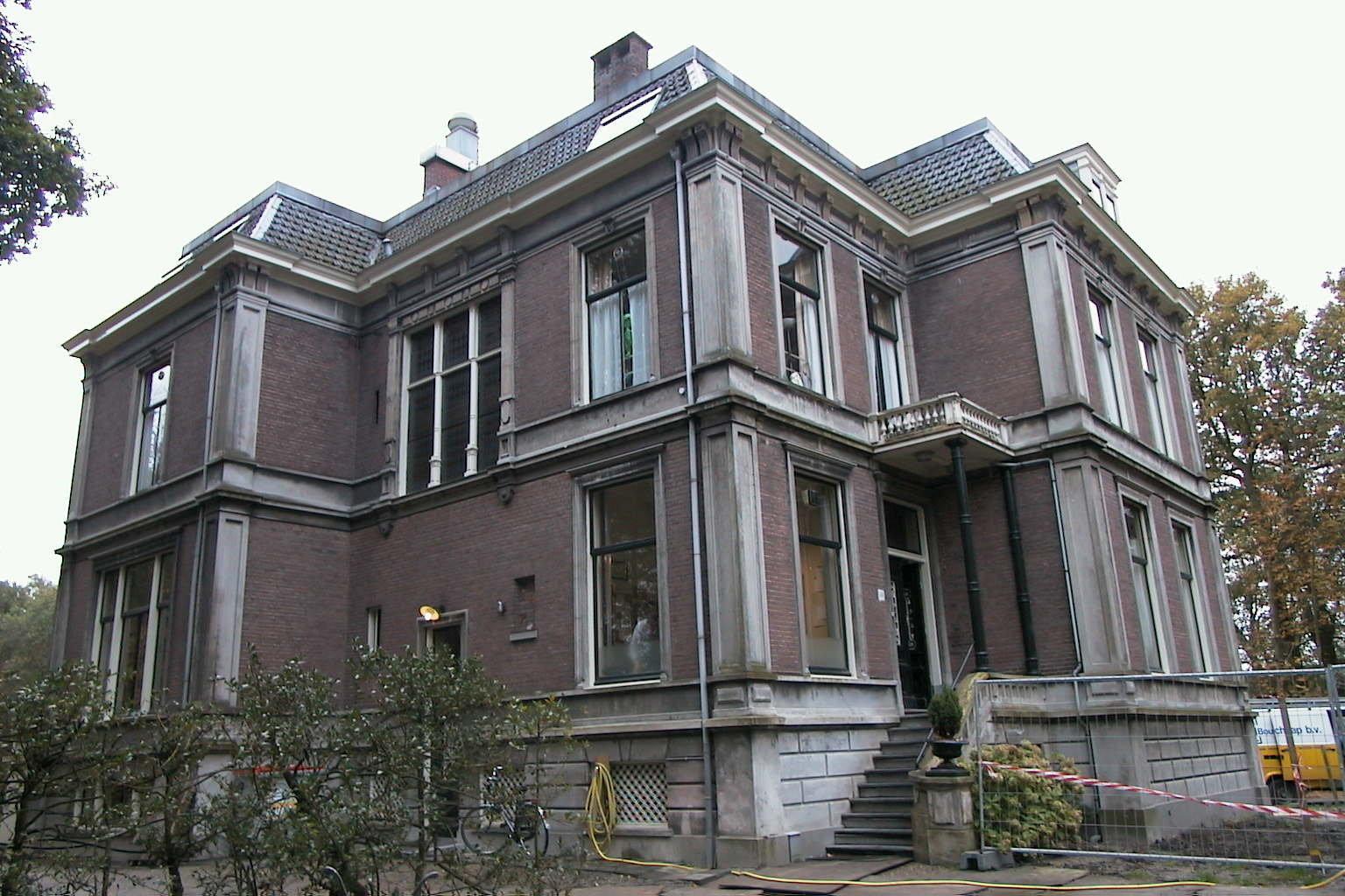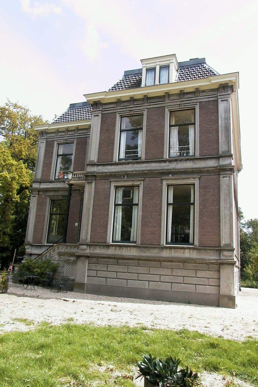 Blokvormig buitenhuis met in- en uitspringende bouwvolumes op samengestelde rechthoekige plattegrond, bestaande uit twee bouwlagen op souterrain, onder met gesmoorde kruispannen en dakleer gedekte afgeplatte schilddaken. De in rode baksteen opgetrokken gevels op natuurstenen plint worden geleed door in natuursteen uitgevoerde ornamenten: horizontaal door friezen tussen cordonlijsten en verticaal door hoekpilasters met verdiept paneel. In het bovenste fries dragen consoles de overstekende, geprofileerde houten gootlijst. De T-vensters en de schuifvensters met bovenlicht zijn voorzien van houten kozijnen en een geprofileerde natuurstenen omlijsting. Een aantal souterrainvensters is afgeschermd met een siersmeedijzeren rooster. De originele dakkapellen zijn voorzien van openslaande vensters en een geprofileerde houten omlijsting. Voorgevel (west): links een gevel bestaande uit twee vensterassen, met daarin rechts op de bel étage de ingang. Rechts een hoekrisaliet met twee vensterassen.