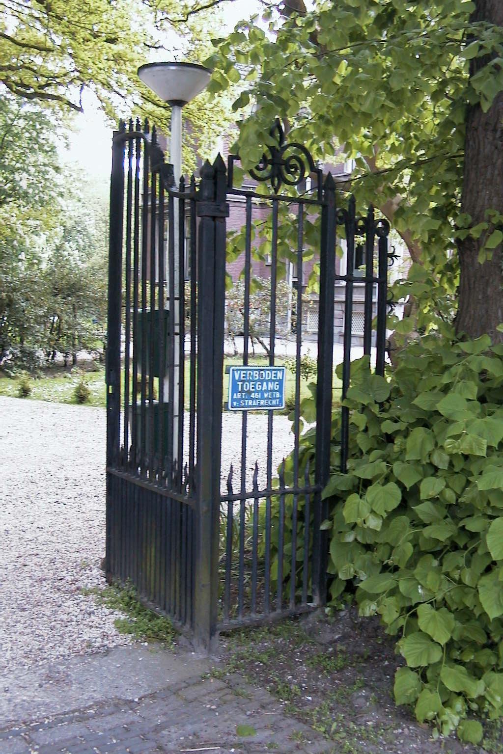 Aan de Westvlietweg gelegen siersmeedijzeren inrijhek, bestaande uit een dubbel spijlenhek tussen krullen bekroonde vaste hekdelen.