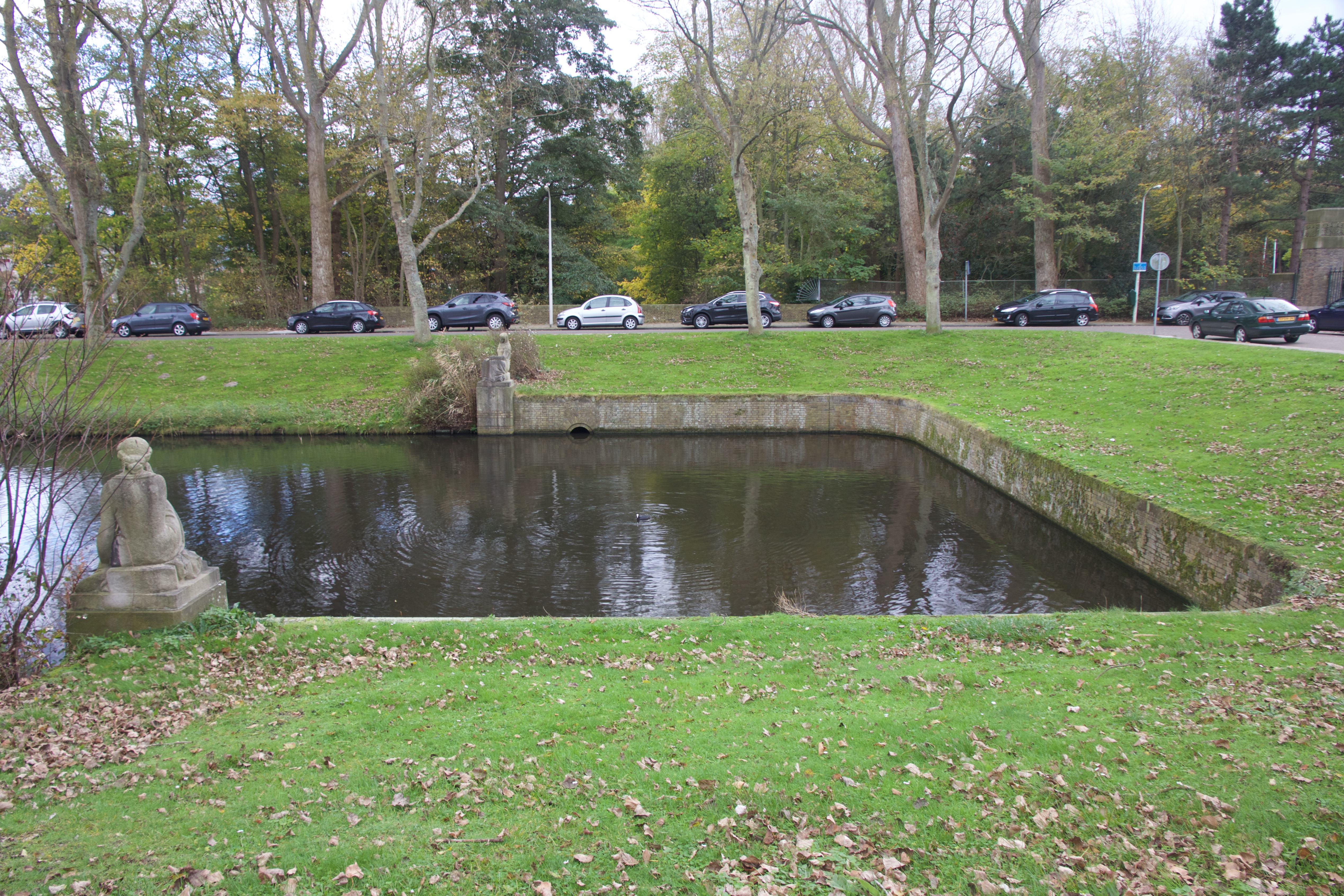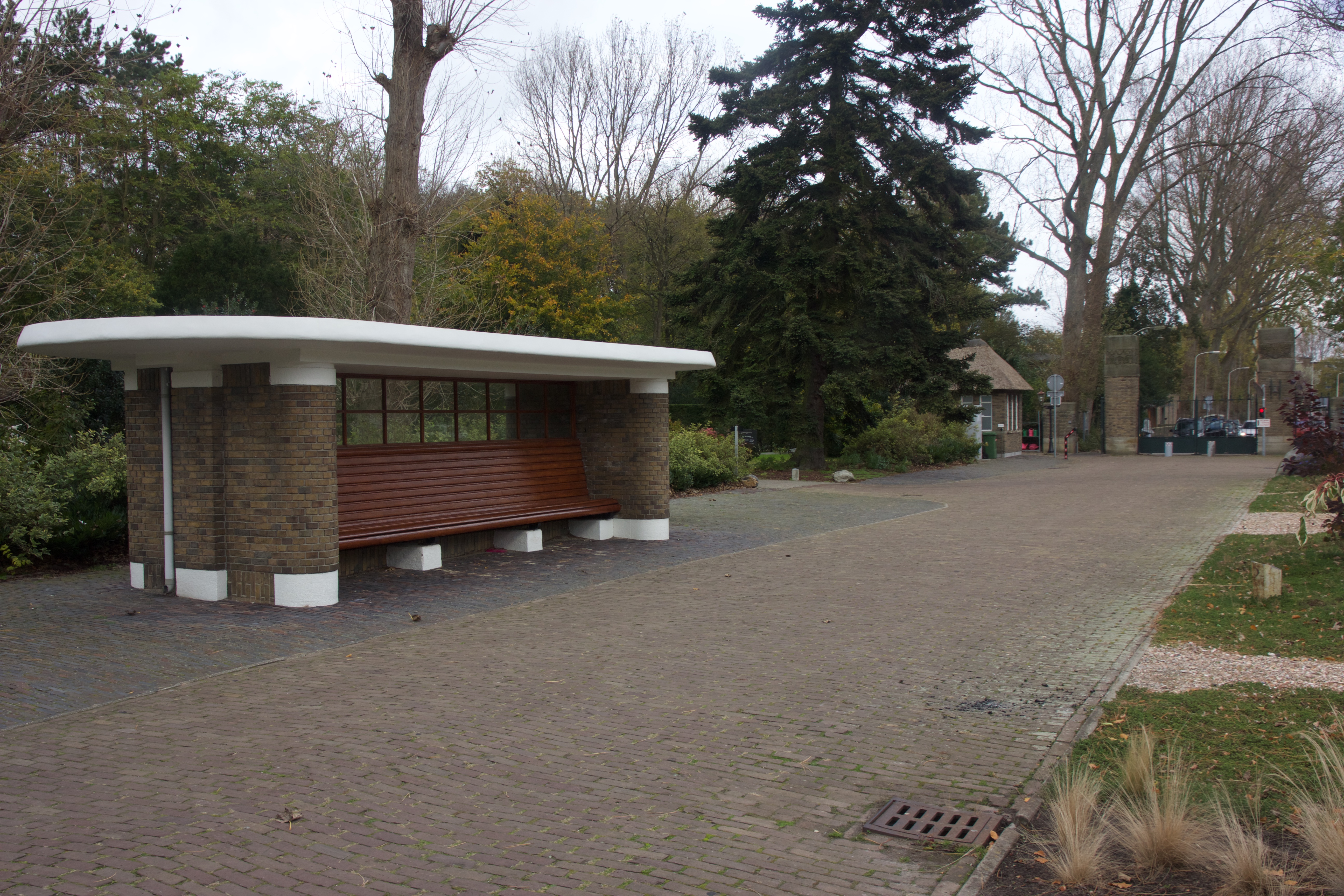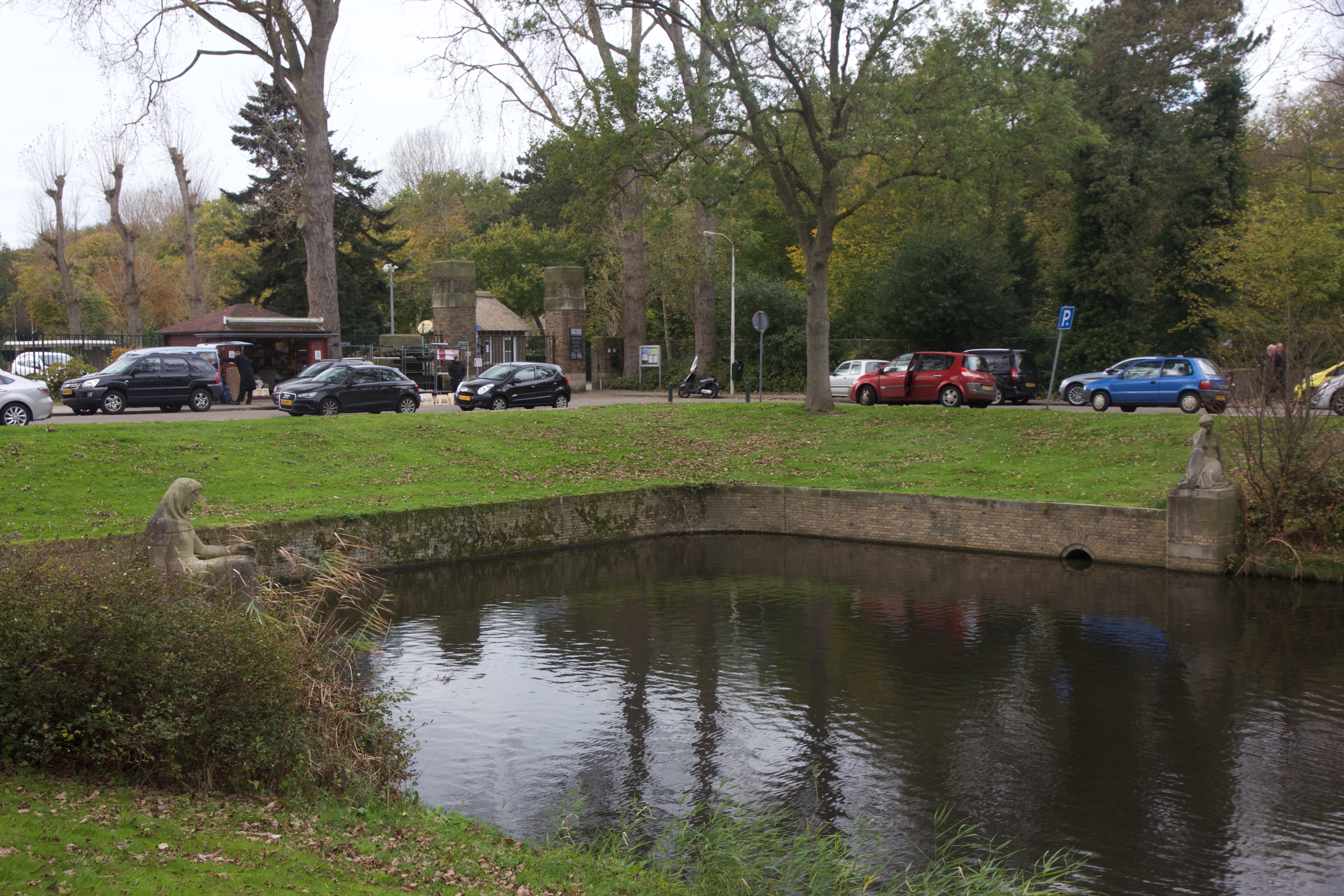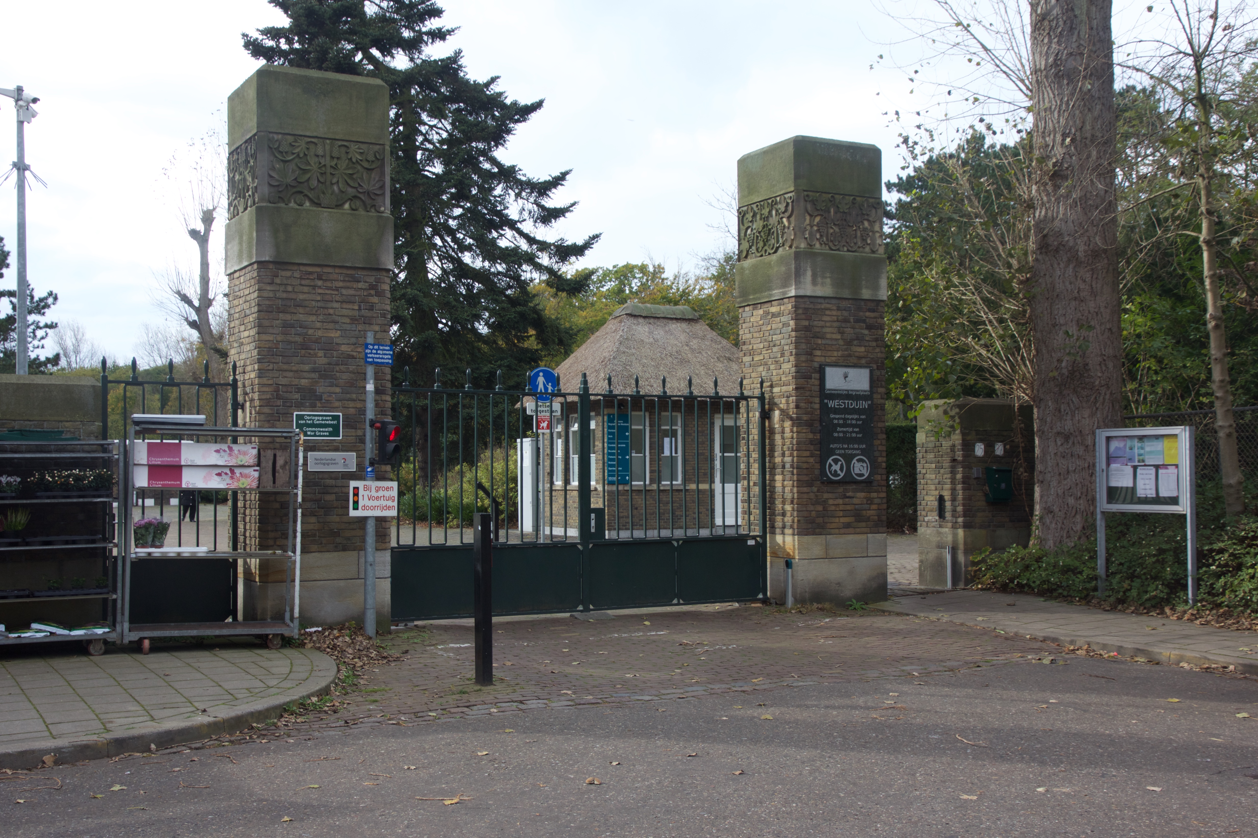 Aula, bijgebouwen, terreinafscheiding met toegangspoorten en vijverpartij op begraafplaats Westduin.