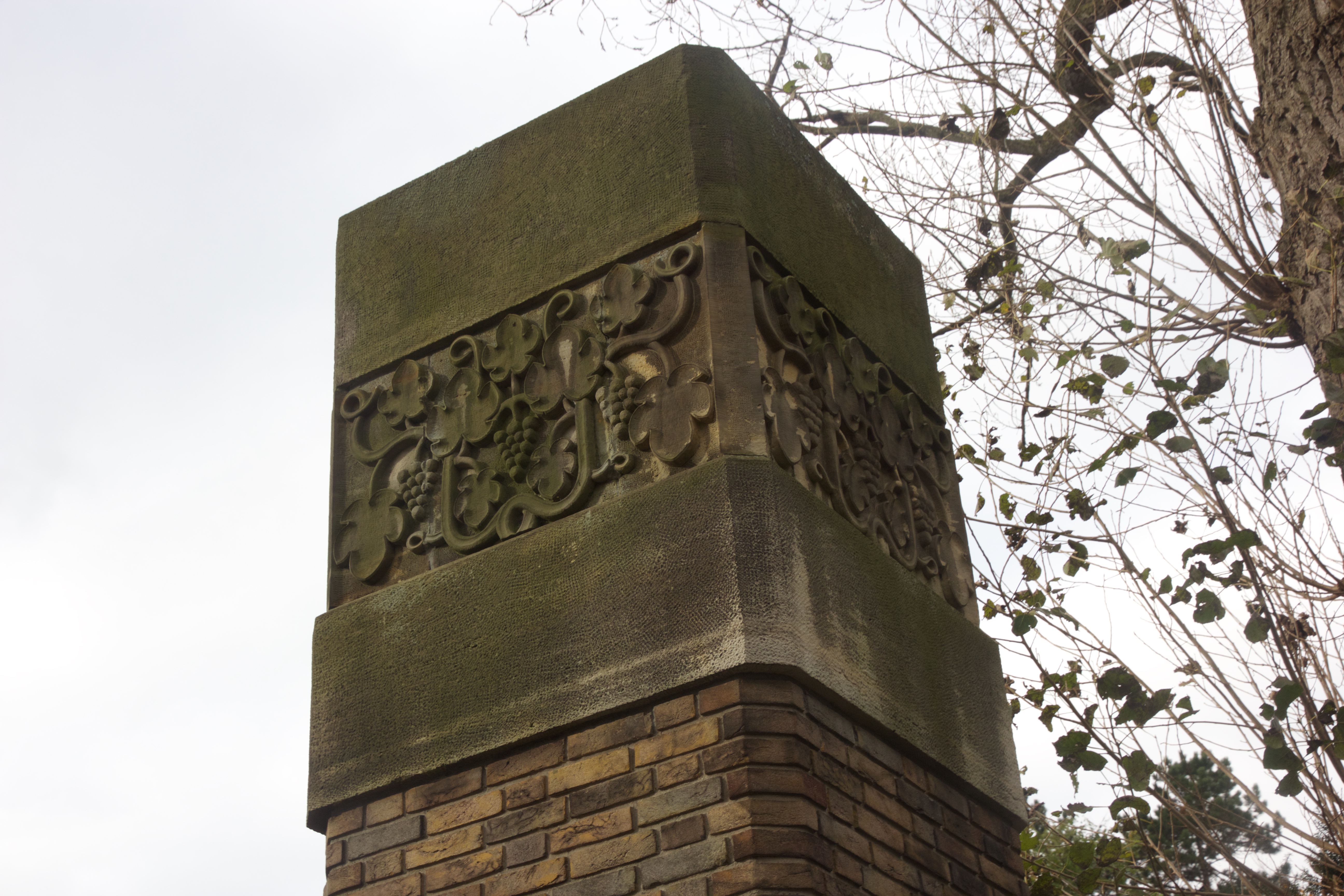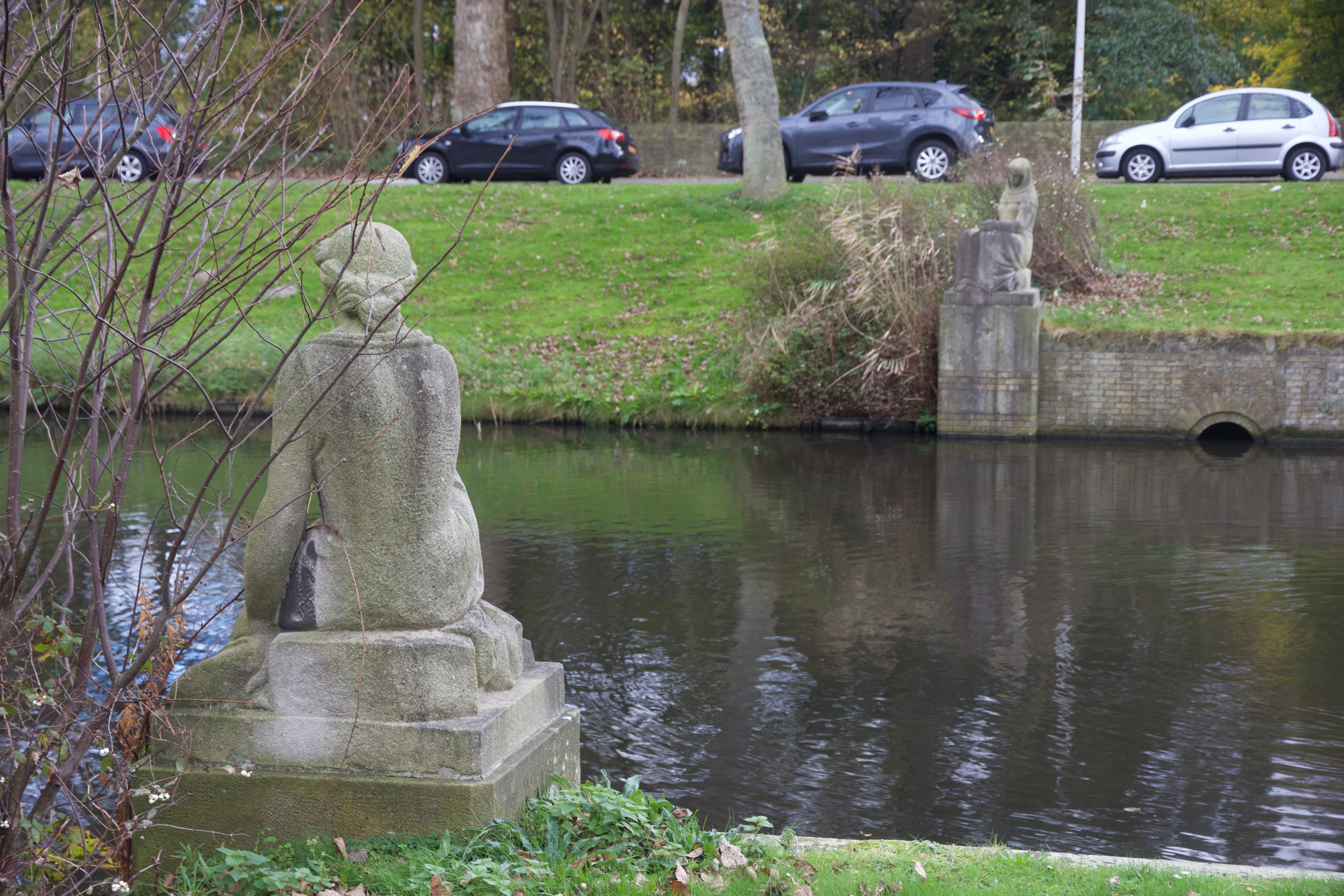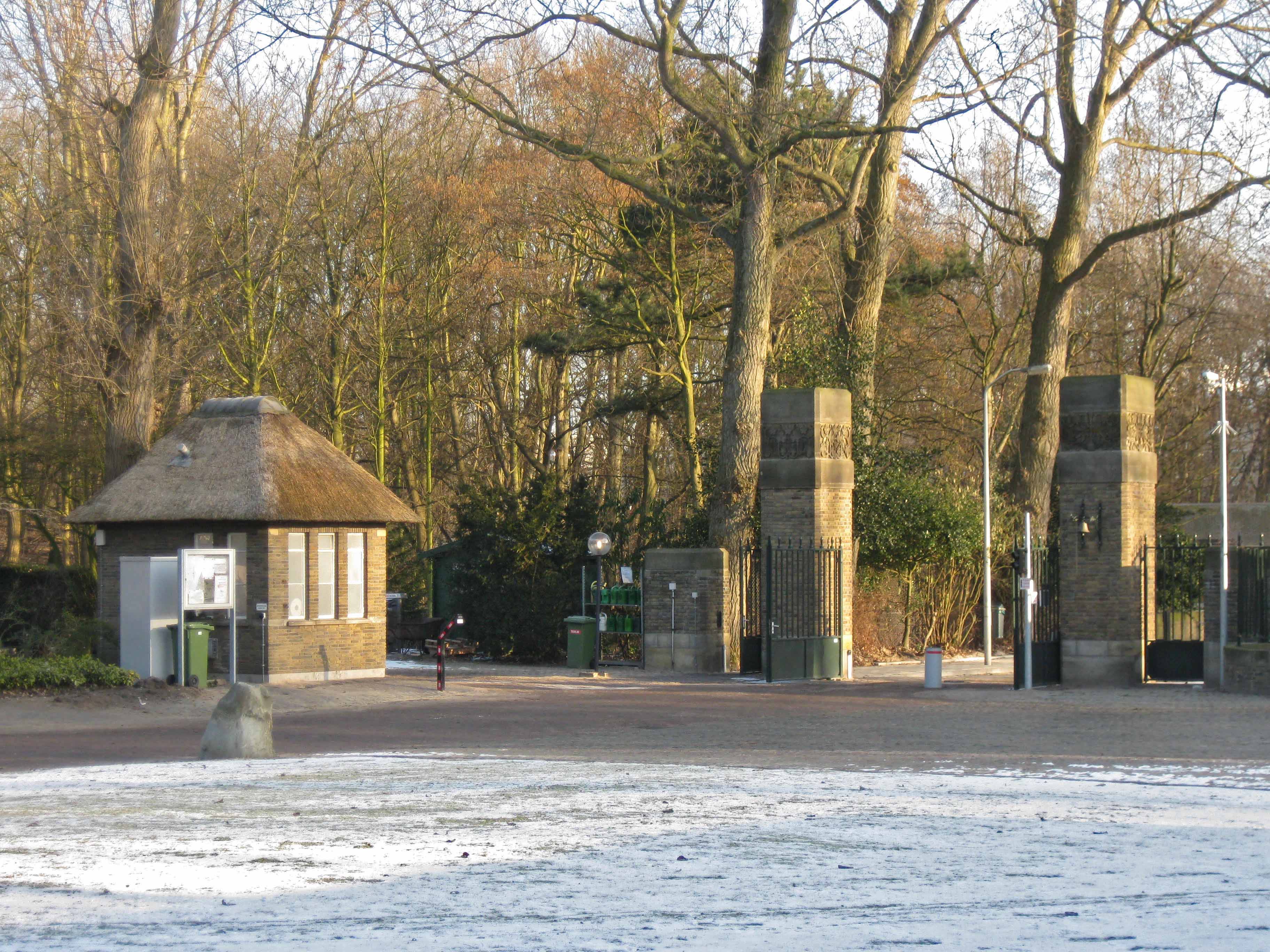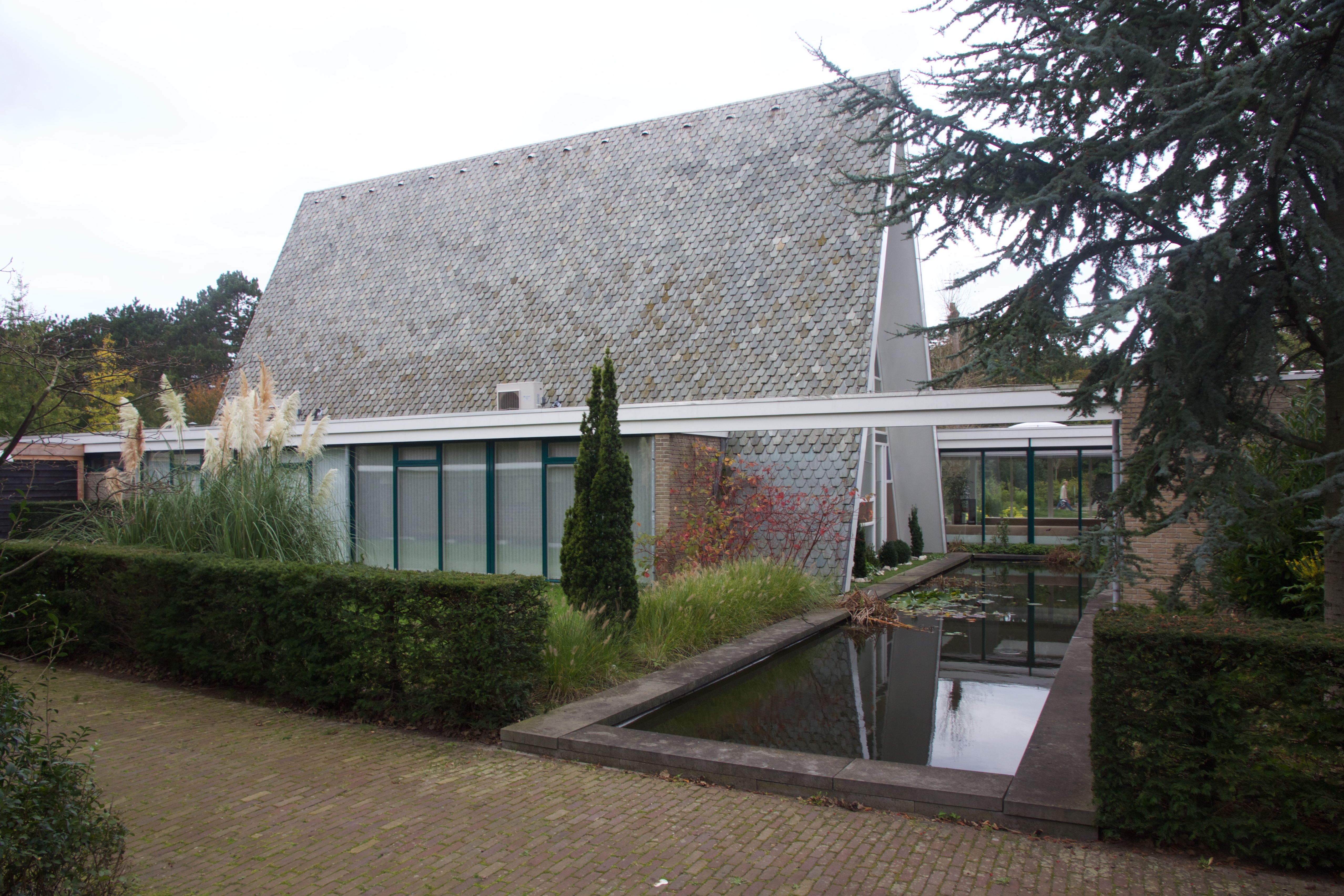 Aula, bijgebouwen, terreinafscheiding met toegangspoorten en vijverpartij op begraafplaats Westduin.