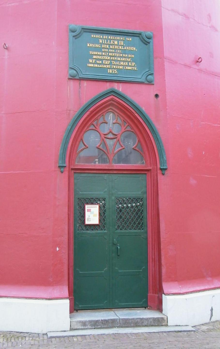 De schacht bestaat uit ijzeren platen, die zodanig zijn geconstrueerd, dat een metselverband van grote steenblokken wordt gesuggereerd. De toren heeft twee spitsbogige ingangen met traceringen in de boogvelden, boven een waarvan het opschrift: "Onder de regering van Willem III, koning der Nederlanden enz. enz. enz., tijdens het bestuur van den minister van Marine W.F. van Erp Taalman Kip, voor draailicht tweede grootte. 1875".