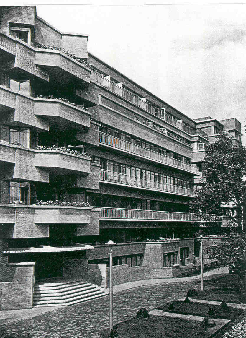 In de expressionistisch vormgegeven toren op de hoek van de twee vleugels was oorspronkelijk een aanvullend waterreservoir ondergebracht. De bakstenen toren is uit kwadranten opgebouwd, die gedeeltelijk overhoeks geplaatst zijn. De bovenste geleding van de toren heeft een decoratie met gesinterd aardewerk; de afdekking is bekleed met roodkoper. Glas-in-lood is te vinden in de verticale vensterpartijen. Op de parterre van de toren is de hoofdentree gesitueerd. Hierachter bevindt zich de centrale hal met het trappehuis dat met mozaïek is verfraaid. De oorspronkelijke indeling van de appartementen was fexibel; toekomstige bewoners bepaalden zelf in hoge mate de indeling van de luxueuze appartementen. Deze varieerden in grootte en aantallen kamers. De inrichting van de appartementen was functioneel en herinnerde aan de De Stijl-beweging. In 1959 is de flat in gebruik genomen als Ministerie van Sociale Zaken waarvoor de oorspronkelijke interieurs ingrijpend werden gewijzigd.