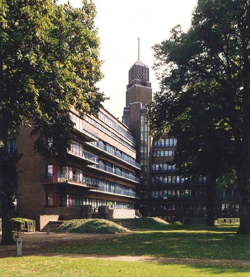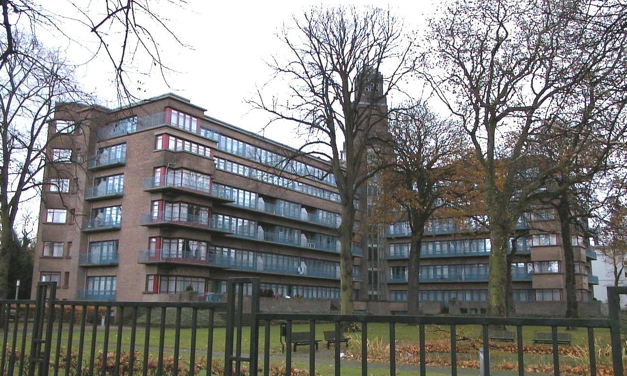 Rondom het aan de rand van het villapark Willemspark gelegen flatgebouw is een fraaie tuinaanleg met oud geboomte.