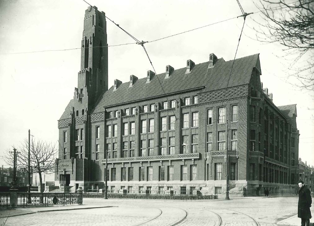 De gevels zijn in schoon metselwerk opgetrokken met expressionistische metselverbanden in de trant van de Amsterdamse School. Veel aandacht is besteed aan de detaillering en de toepassing van rijke materialen. Het metselwerk springt voor- en achteruit in het gevelvlak waar de hoofdingang met de toren is opgenomen en die gevelvlakken die drie vensterassen breed zijn. Natuursteen is ondermeer gebruikt voor het rustica van de plint; ter hoogte van onderdorpels van de vensters; de tussendorpels van de vensters van de tweede bouwlaag en voor consoles en sluitstenen. Het beeldhouwwerk aan de gevels is van de hand van J. van Lunteren. De vensters zijn tijdens een laatste restauratie vervangen door aluminium vensters. De nieuwe aluminium kozijnen zijn in de groene kleur van de oorspronkelijke stalen kozijnen gemoffeld.