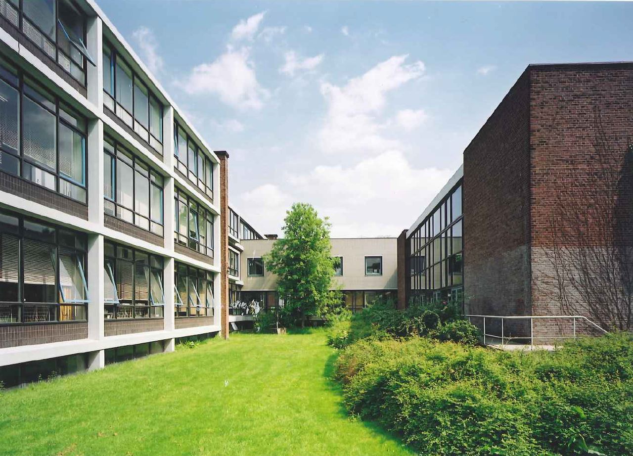 Vanuit het voorgebouw leidt een gang naar het centrale trappenhuis van het hoofdgebouw. Het trappenhuis ligt ongeveer in het midden van het hoofdgebouw en verdeelt het zodoende in twee vleugels. De oostelijke vleugel huisvest 22 voormalige leslokalen verdeeld over drie verdiepingen. Tussen twee lokalen ligt steeds een kleinere ruimte die dienst deed als vakbibliotheek, als alternatief voor één centrale bibliotheek. De indeling van deze lokalen is tamelijk goed bewaard. De lokalen doen nu dienst als bedrijfsunits. De oostelijke vleugel wordt afgesloten door twee boven elkaar gelegen gymlokalen die haaks op de hoofdbouw staan. Tussen de voorbouw en het gymnastiekblok is zodoende een omsloten schoolplein ontstaan, waaraan zich nu de entree bevindt. De bestrating van het plein sluit aan bij de assen van de gevel. In de gymzalen zitten nu dansstudio’s. In de westelijke vleugel bevinden zich acht speciale vaklokalen met hogere plafonds. Dit zijn nu cursusruimtes.