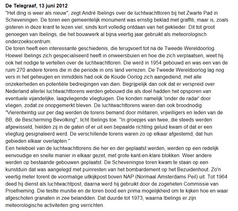 De in schoon metselwerk opgetrokken Scheveningse luchtwachttoren op vierkante plattegrond is 6,5 meter hoog en staat ca. 32 meter boven NAP. Door middel van een in de toren opgenomen trap is het uitkijkplatform bereikbaar. De houten binnendeuren, trap en ramen zijn nog aanwezig. De buitendeur in de westgevel is circa 10 jaar geleden vervangen door een nieuw staal exemplaar. De toren maakte onderdeel uit van een landelijk netwerk van uitkijkposten dat tussen 1950 en 1960, tijdens de Koude Oorlog in ons land was opgezet om in tijden van spanning of oorlog laagvliegende vliegtuigen te kunnen signaleren. Dit signaleren kwam neer op melden en volgen van laagvliegende vijandelijke vliegtuigen in het Nederlandse luchtruim. Vliegtuigen beneden de 1500 meter konden met de toenmalige radartechniek niet effectief worden waargenomen en gevolgd; dat gebeurde op gehoor en met kijkers. De Scheveningse luchtwachttoren vormde een zogenaamde driehoek met een luchtwachttoren in Zoeterwoude en één op een bunker in Noordwijk. Het landelijk netwerk is in gebruik geweest tot 1964, het jaar waarin het Korps Luchtwachtdienst werd opgeheven. Na beëindiging van het luchtwachtgebruik is de toren tot circa 1973 gebruikt door Defensie voor schietoefeningen vanaf de Waalsdorpervlakte. Sindsdien is de toren in gebruik voor meteo-activiteiten. Van de in totaal 276 door heel Nederland opgerichte luchtwachtposten werd de helft gerealiseerd op bestaande gebouwen. Van de andere helft, circa 140 in opdracht van de Genie gebouwde losse torens, zijn er nog slechts 18 over. Dit zijn alle in geprefabriceerde gewapend raadbetonelementen uitgevoerde torens, met uitzondering van de Scheveningse toren die in baksteen is opgemetseld..
